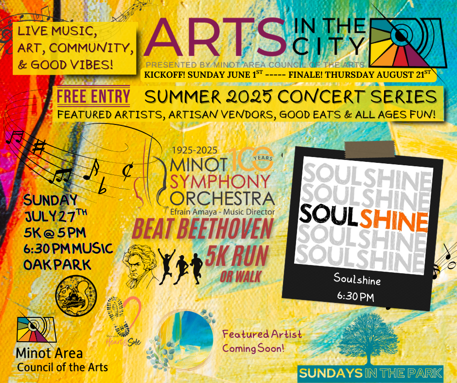 2025 Arts in the City – July 27th Oak Park 5:00 pm Minot Symphony Orchestra 5k – 6:30 pm Soulshine + Add to Google Calendar + iCal / Outlook export Tags: Minot Symphony Orchestra, Soulshine Date Jul 27 2025 Expired! Time 4:00 pm - 7:00 pm Location Oak Park Category Arts in the City Organizer MACA Share this event