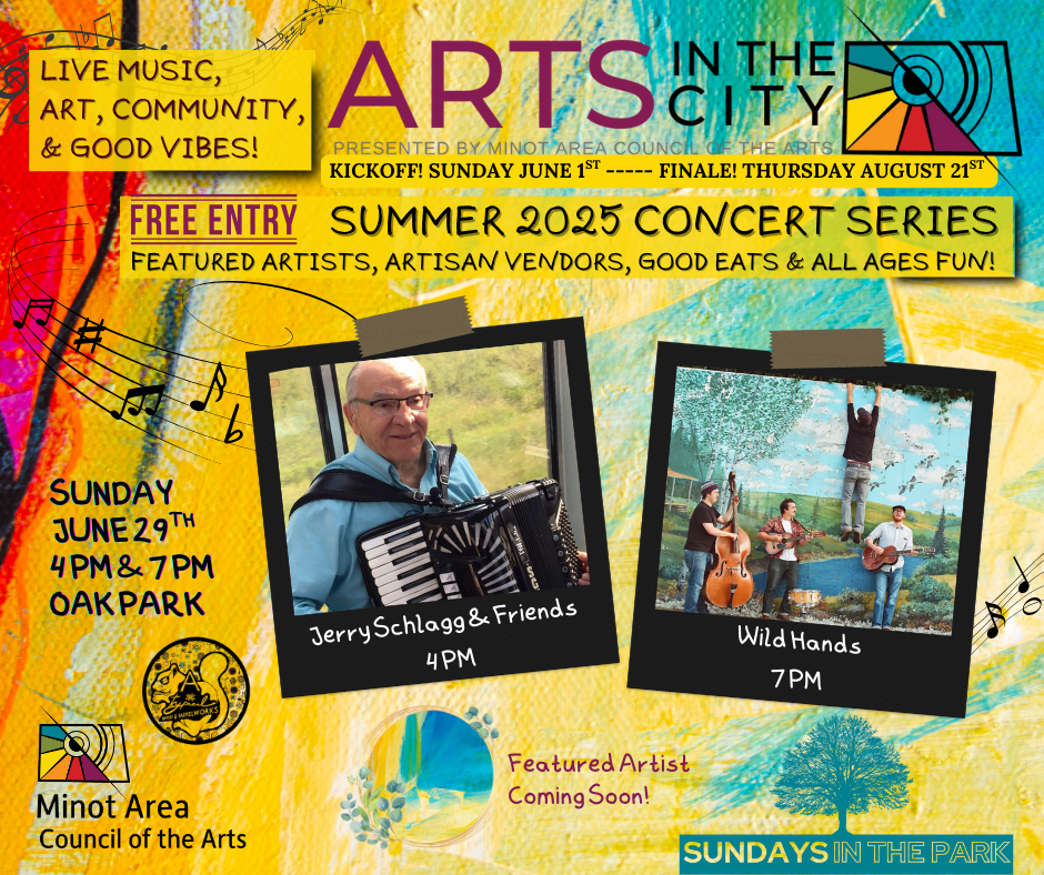 2025 Arts in the City – Jun 29th Oak Park 4:00 pm Jerry Schlagg & Friends 7:00 pm Wild Hands + Add to Google Calendar + iCal / Outlook export Tags: Jerry Schlagg & Friends, Wild Hands Date Jun 29 2025 Expired! Time 4:00 pm - 7:00 pm Location Oak Park Category Arts in the City Organizer MACA Share this event